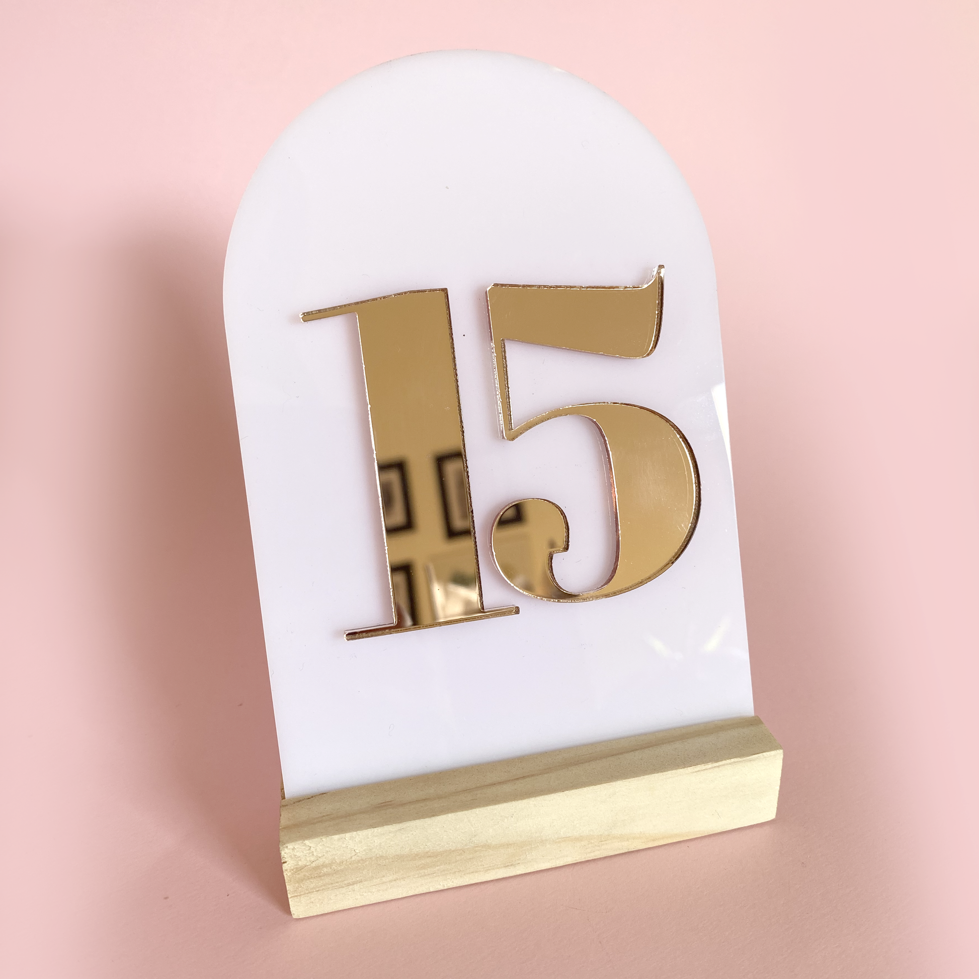 El número de mesa está fabricado en lámina de acrílico blanco de 10 x 15 cm e incorpora números en acrílico espejo metálico, logrando un contraste moderno y llamativo. Su diseño autoportante incluye una base de madera que le da estabilidad y un toque cálido y natural.